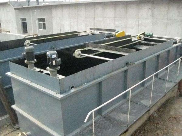 未經處理的污水首先進入曝氣殼氣段,與微氣泡充分混合,微氣泡在上升的過程中將固體懸浮物帶到水面,刮泥機沿液面動行將懸浮物刮到傾斜料的金屬板上,再將其推入污泥排放管道,污泥排放管道內有水平的螺旋推進器,將所收收污泥送入污泥收集器。推進器和刮泥機由同一個馬達驅動。動力只有0.5馬力,污水凈化后在排放前會經斜板下方的溢流槽,溢流槽用來控制氣浮槽的水位,確保槽中的液體不會流入污泥排放管道,開放的咽流管道從曝氣段沿著氣浮槽的底部伸展,在產生微氣泡的同時,渦凹曝氣機會在有回流管的池部伸展,在產生微氣泡的同時,渦凹曝氣機會在有回流管的池底形成一個負壓區,這種負壓作用會使廢水從池子的底部回流到曝氣區,然后又返回氣浮段。這個過程確保在有進流量的情況下,氣浮仍不斷進行。