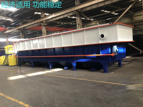 經加藥反應后的污水進入氣浮的混合區,與釋放后的溶氣水混合接觸,使絮凝體粘附在細微氣泡上,然后進入氣浮區。絮凝體在氣浮力的作用下浮向水面形成浮渣,下 層的清水經集水器流至清水池后,一部分回流作溶氣使用,剩余清水通過溢流口流出。氣浮池水面上的浮渣積聚到一定厚度以后,由刮沫機刮入氣浮機污泥池后排出,氣浮底部的淤泥定時間用抽糞車吸出外運,或者是打開排污閥自流入污泥收集池,用污泥脫水機脫水處理,從而減少二次污染,安全可靠。