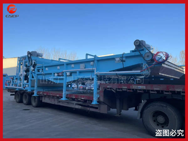 通過預壓脫水大直徑的過濾輥,?將大量的游離水脫掉,為泥餅順利進入擠壓脫水區,進入“?S?”壓榨段,在“?S?”型壓榨段中,污泥被夾在上、下兩層濾布中間,經若干個壓榨輥反復壓榨,上下兩條濾帶在經過交錯各輥形成的波形路徑時, 由于兩條濾帶的上下位置順序交替,對夾持的泥餅產生剪切力,?將殘存于污泥中的水分絕大部分積壓濾除,促使泥餅再一次脫水,后通過刮板將干泥餅刮落。