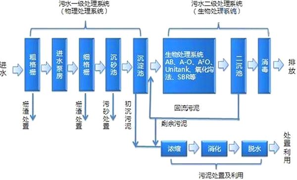 污水經格柵攔截去除水中廢渣、紙屑、纖維等固體懸浮物,進入調節池,在調節池內均質、均量后經泵提升至A級生物池,在A級生物池段異養菌將污水中可溶性有機物水解為有機酸,使大分子有機物分解為小分子有機物,不溶性的有機物轉化成可溶性有機物,將蛋白質、脂肪等污染物進行氨化。