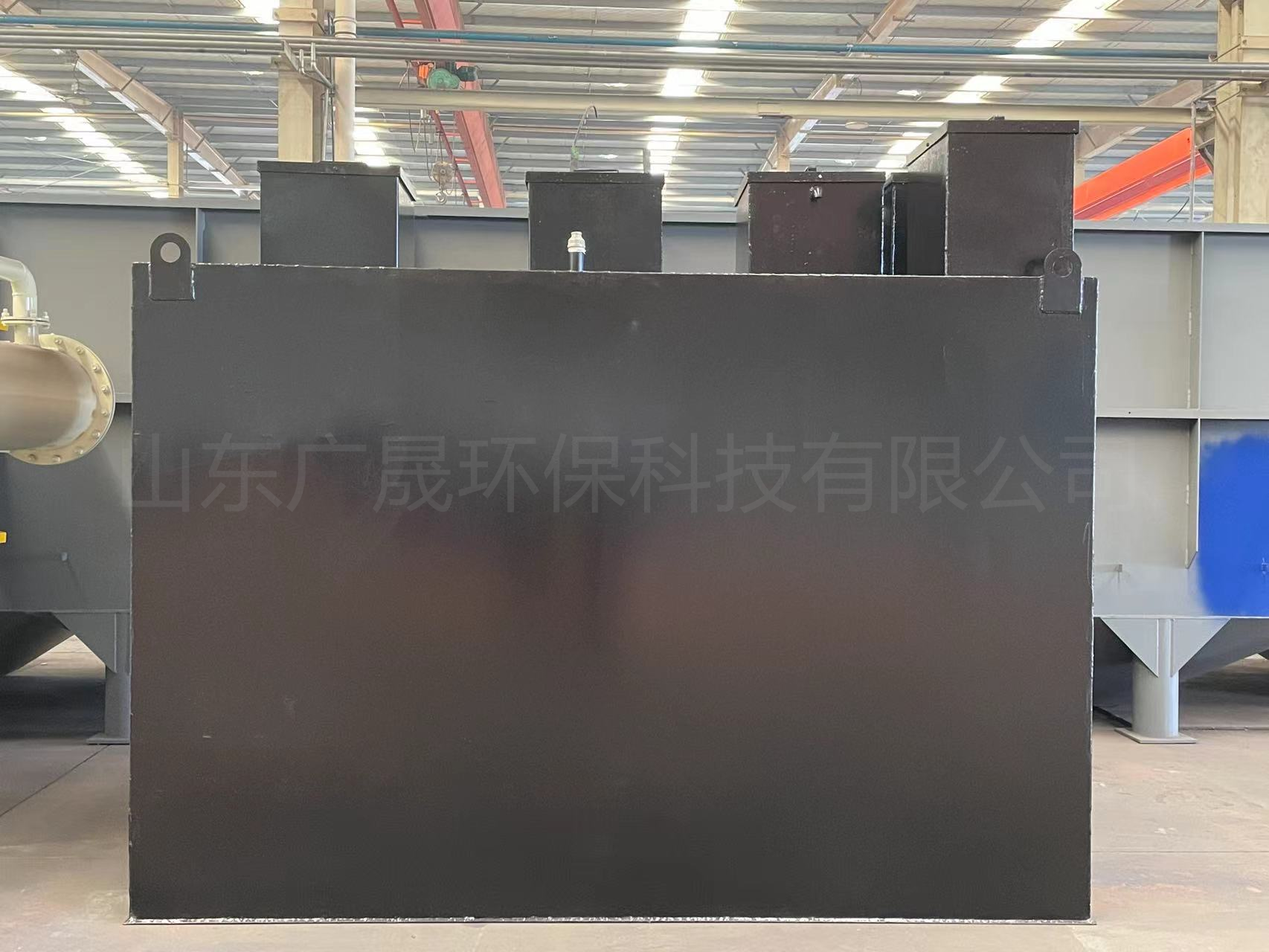 其一側設置有進水口,反應池內設置有浸沒式簾式膜組件,容納有活性污泥,周邊曝氣和膜片曝氣管路與風機聯通,膜組件上配套的集水管與抽吸泵聯通,待處理的污水通過進水口進入 MBR 生化反應池,污水在反應池內的 HRT 為 5h。經反應池內的活性污泥降解后,通過抗污染平板膜組件,然后由抽吸泵吸出進入清水消毒池。反應池內還設置有污泥提升泵,可以把多余的污泥提升到污泥硝化池內。反應池上部開有溢流口,可以使污水自流到箱外調節池。下部一側開放空口,便于池內結構維護、清理。