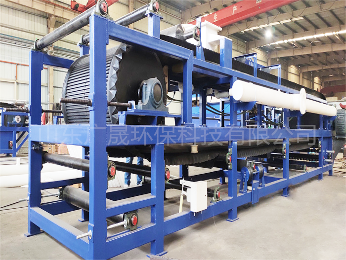 石化真空過濾機以濾布為過濾介質,采用整體的環形橡膠帶作為真空室。環形橡膠帶由傳動裝置傳動連續運行,濾布鋪敷在膠帶上與之同步運行,腔帶與真空滑臺接觸(真空室與橡膠帶間裝有環形摩擦帶并通入水形成水密封),料漿由布料器均勻地分布在濾布上。當真空室接通真空系統時,在橡膠帶上形成真空抽濾區,濾液穿過濾布經橡膠帶上的橫溝槽匯總并由中心孔進八真空室,固體顆料被截留在濾布上形成濾餅,隨著橡膠帶的移動,已形成的濾餅受壓力差影響逐步被脫干,后濾布與膠帶分開,在卸料輥處將濾餅卸出,進入真空室的液體經氣水分離器排出。卸除濾餅后濾布經清洗后獲得回用,再經過一組支撐輥和糾偏裝置重新進入過濾區,開始進入新一過濾周期。石化真空過濾機實現了真正意義上的連續運行、連續過濾,物料從進料、脫水、卸渣到濾布清洗,可以不間斷的連續進行。